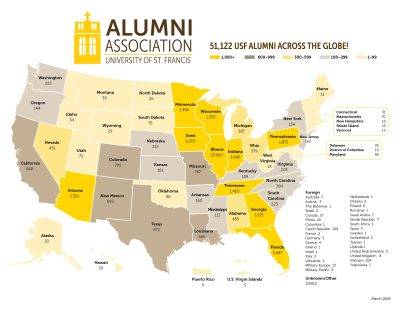 Whether you earned your degree at USF’s main campus in Joliet, Illinois, our campus in Albuquerque, New Mexico, at an off-campus site or online, you’re a USF graduate and therefore a member of our Alumni Association!