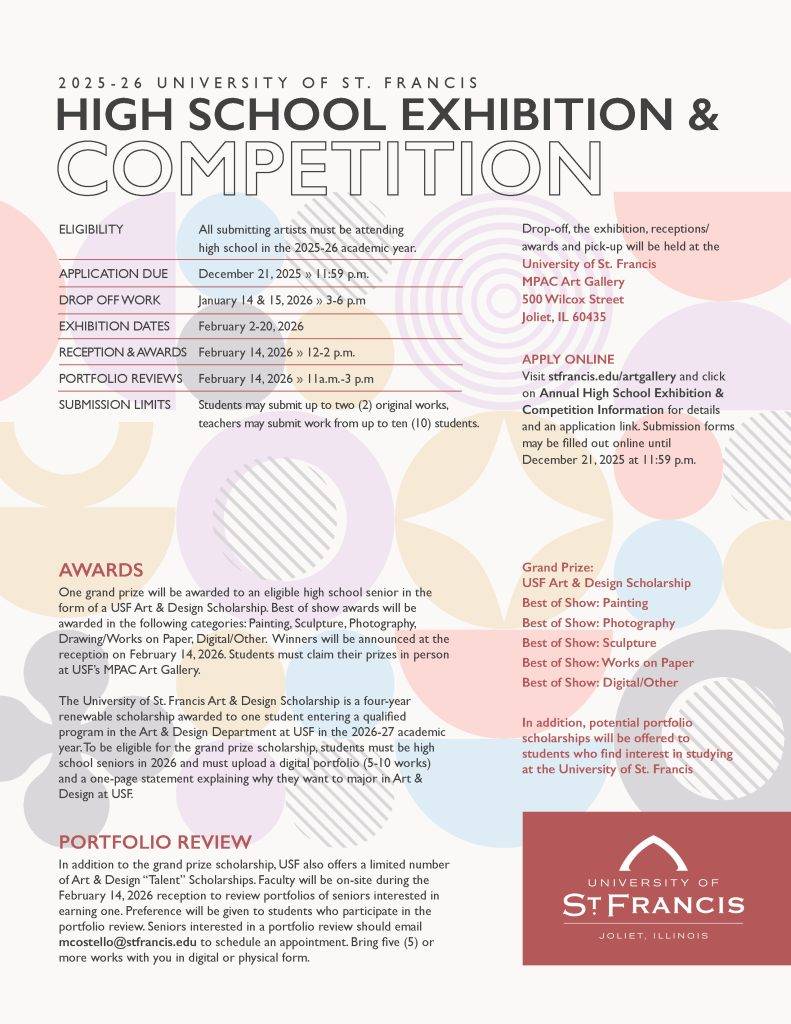 USF Gallery is proud to host the annual St. Francis Student Artist Exhibition. The exhibition is open to all USF students, any major. All are welcome to join us for a light breakfast with USF President Arvid Johnson and College of Arts & Sciences Dean Elizabeth Davies on Thursday, April 2, 2019 at 10:30 a.m. Winners and scholarship awards will be announced at the breakfast